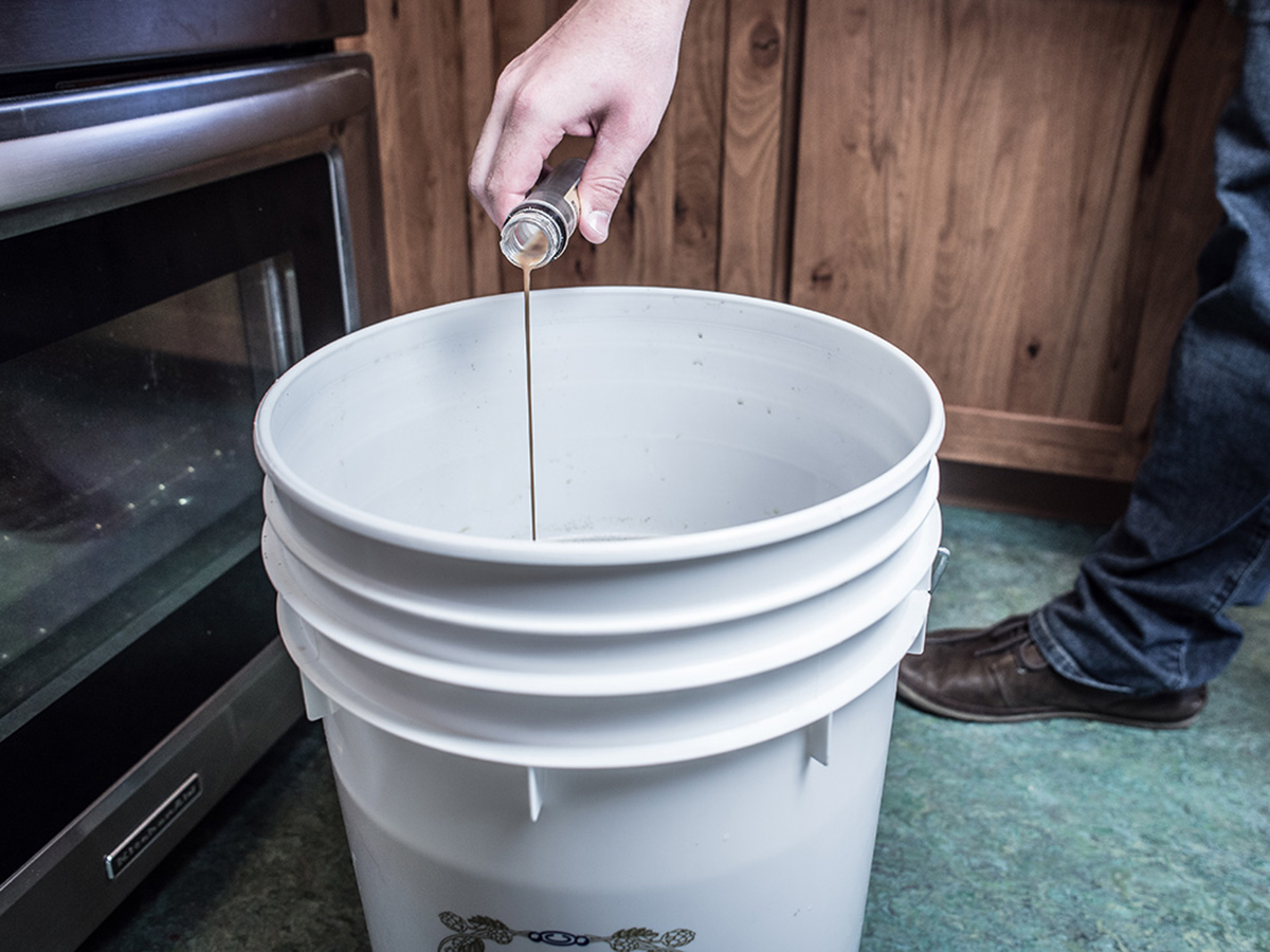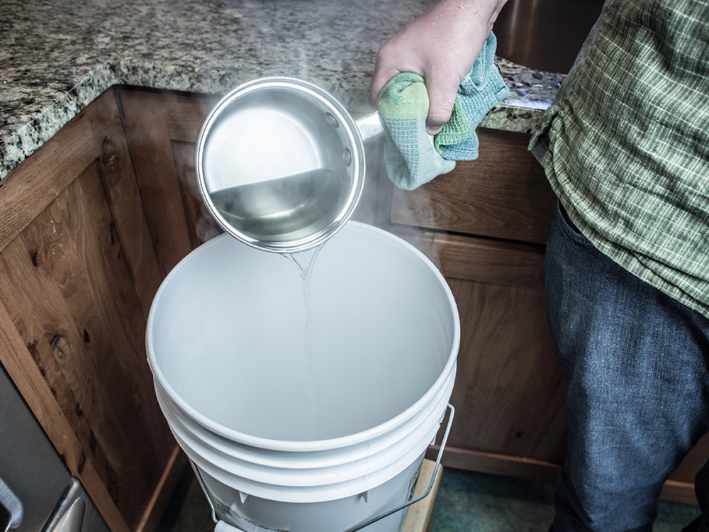 Fill the fermenter with cool water to reach 5 gallons, and allow the wort to sit until it drops in temperature to 70-75°F (21-24°C).