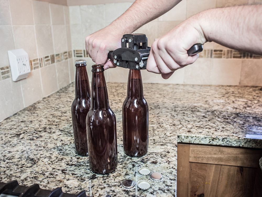 Carefully cap the bottles with sanitized caps using a sanitized bottle capper.