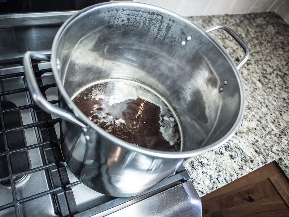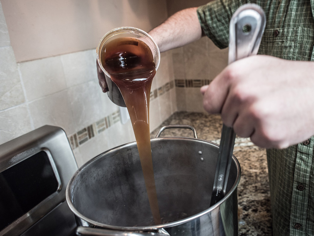 Once boiling, remove the pot from heat and stir in the malt extract, being careful that it does not collect on the bottom of the pot.Stir until completely dissolved.