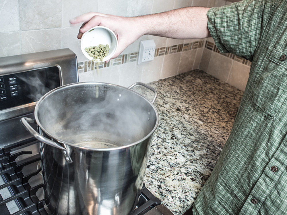 After the liquid reaches a rolling boil, add the bittering hop addition.Note: hop additions are typically labeled with the time left until the end of the boil.