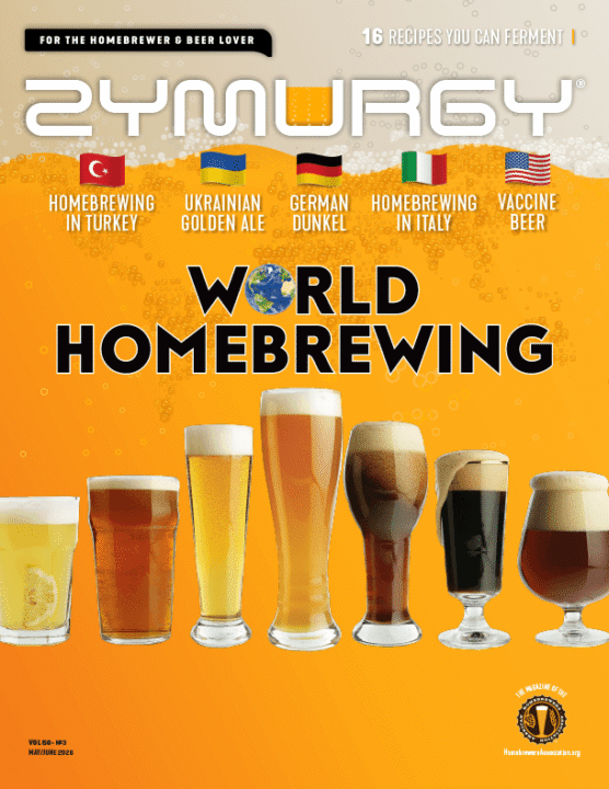 This May/June 2026 issue of Zymurgy takes readers on a global homebrewing tour, from Turkey and Tuscany to Ukrainian Golden Ale, German Dunkel, Italian Saison, and even a story about vaccine beer—plus 14 recipes.